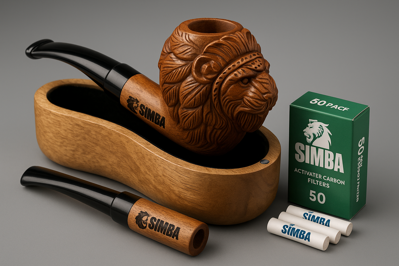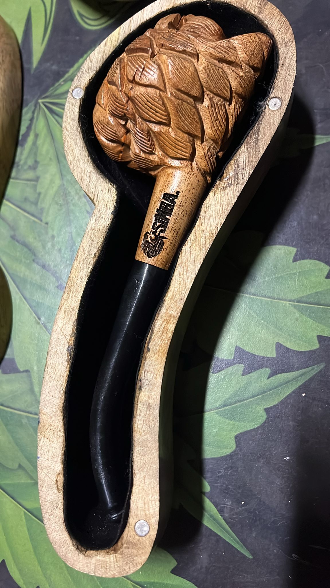 Hand Carved Acacia Wood Pipe with Mango Wood Case + 50pcs Simba 7mm Carbon Filters